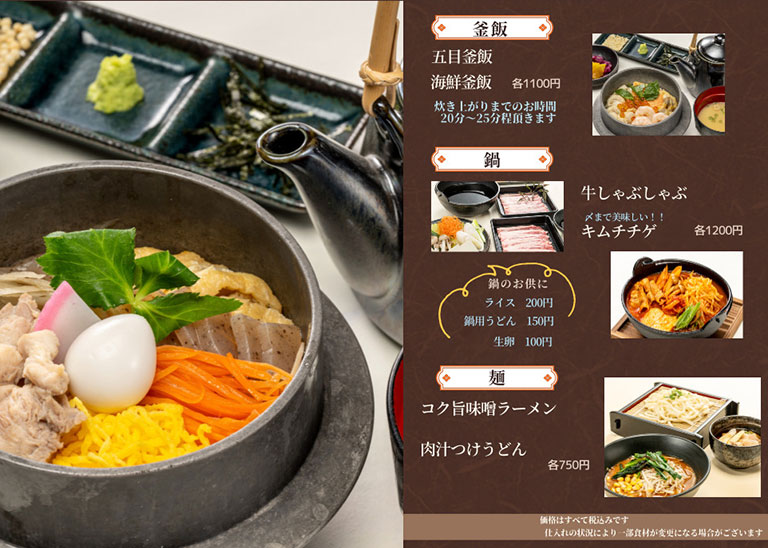 RESTAURANTレストラン HOMEレストラン RESTAURANTレストラン 営業時間 18:00~21:00(釜飯LO 20:00)(食事,飲物LO 20:30) 朝食時間6:30~9:30 絶品のおもてなし心温まる鍋、しゃぶしゃぶ、旨味あるダシの利いた釜めし。 味わい深い充実した料理と美味しいお酒をご堪能ください。 « 朝食 » « 朝食 » « 朝食 »